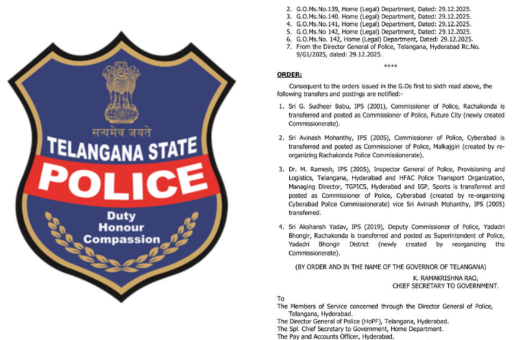 అంతేకాకుండా నూతనంగా ఏర్పాటు చేసిన భువనగిరి పోలీస్ యూనిట్కు అక్షాంక్ష్ యాదవ్ను ఎస్పీగా నియమించింది తెలంగాణ ప్రభుత్వం. ప్రస్తుతం రాచకొండ కమిషనర్గా ఉన్న సుధీర్ బాబును ఫ్యూచర్ సిటీ కమిషనర్గా, సైబరాబాద్ పోలీస్ కమిషనర్గా ఉన్న అవినాష్ మహంతిని మల్కాజ్గిరి పోలీస్ కమిషనర్గా, ఐజీపీ(ప్రొవిజనింగ్ అండ్ లాజిస్టిక్స్)గా ఉన్నడా. ఎం రమేష్ను సైబరాబాద్ కమిషనర్గా నియమించింది.